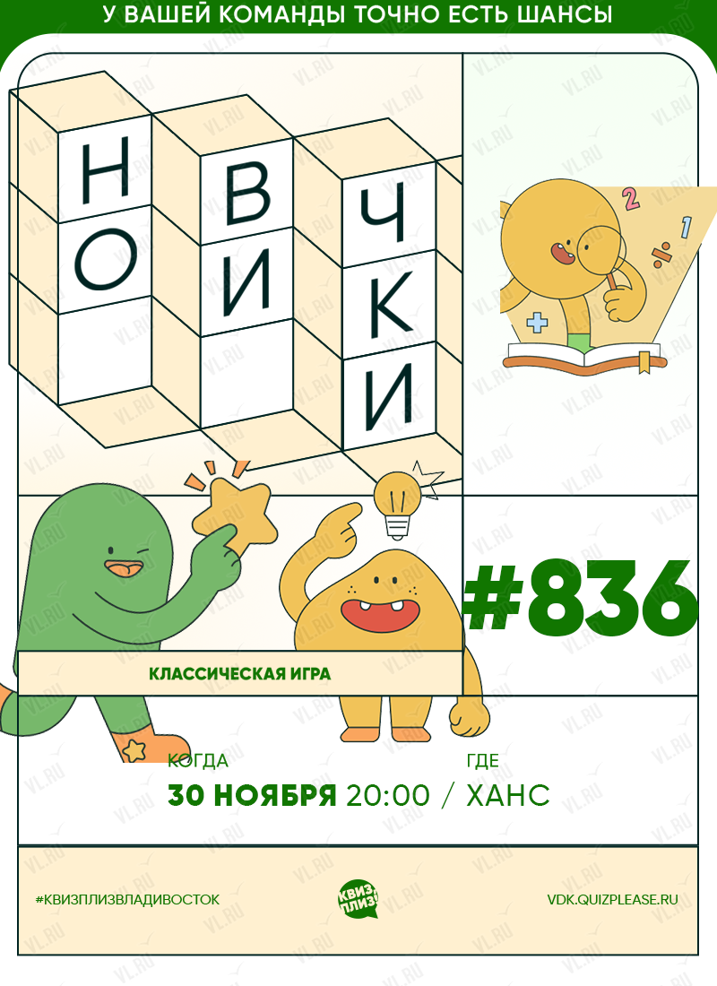 Игра с вопросами на абсолютно разные темы, на которую [новички] могут прийти без сомнений, не переживая, что они знают ещё не всё на свете. Отличная возможность собрать друзей и блеснуть обширными знаниями из самых разных областей, проявить смекалку, проверить свой слух на музыкальность и широко улыбаясь нашему фотографу сделать классные памятные снимки! Познаём Квиз, плиз! и не боимся опытных команд.