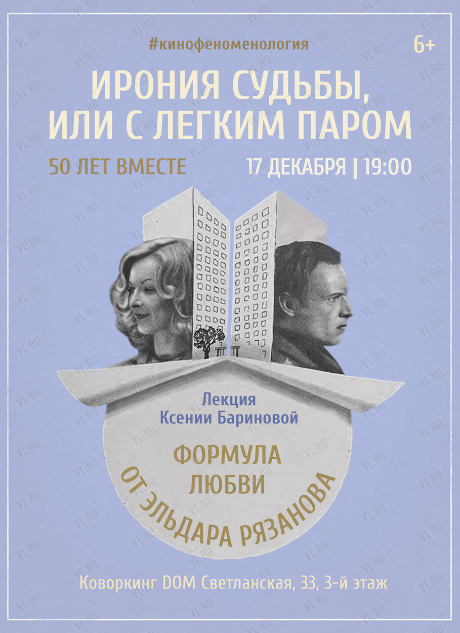 Лекция «"Ирония судьбы, или С легким паром". Формула любви от Эльдара Рязанова» состоится 17 декабря в 19:00 в коворкинге DOM.