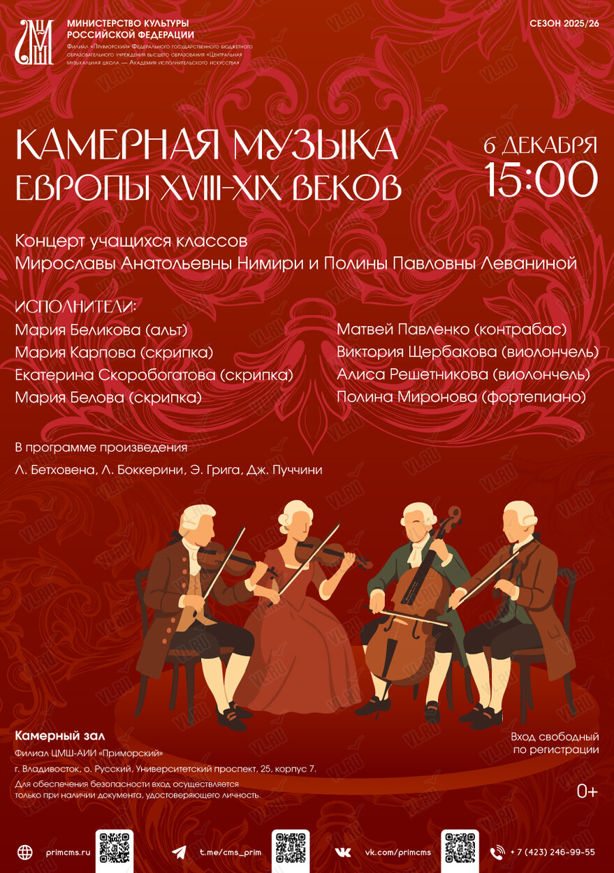 Регистрация на событие «Концерт «Камерная музыка Европы XVIII-XIX веков»», на 6 декабря 15:00 отменена.