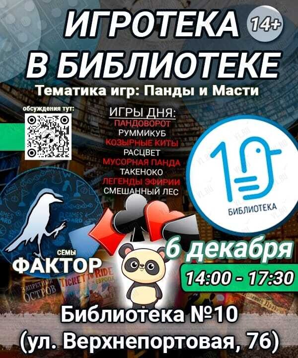 6 декабря, в субботу, приглашаем всех любителей настольных игр на тематическую встречу Игроклуба «Фактор Сёмы» в библиотеку №10!