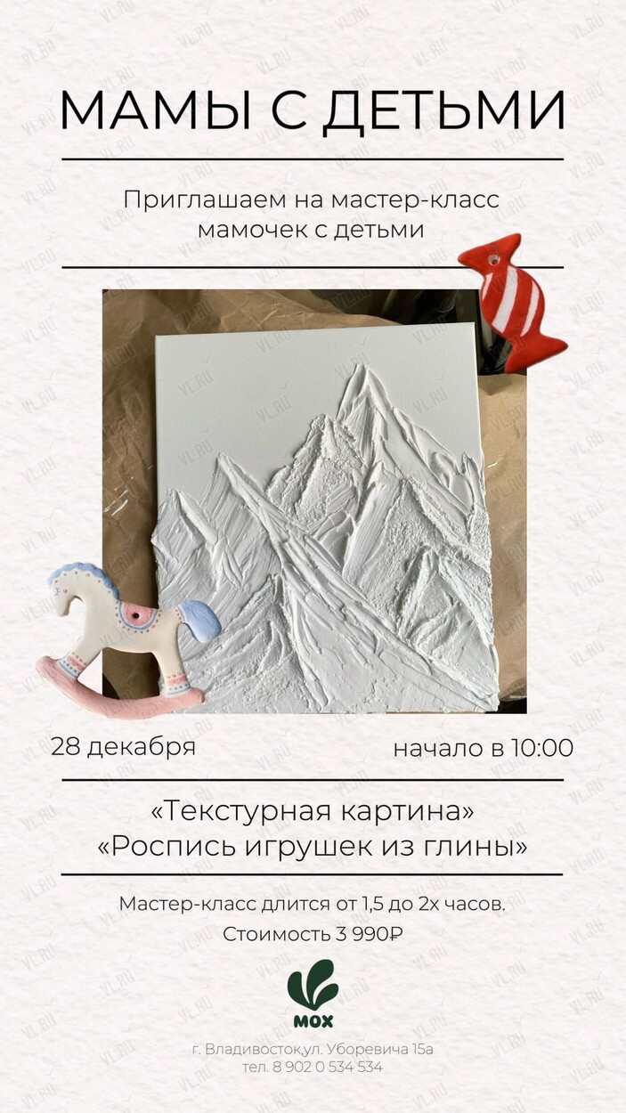 Студия творчества «Мох» приглашает на мастер-класс «Текстурная картина/Роспись игрушек из глины» для мам и детей (от 3 до 6 лет)!
