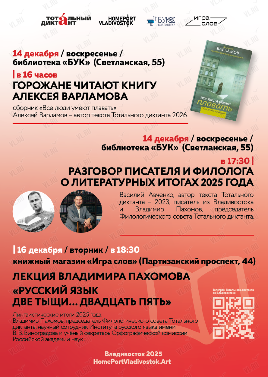14 и 16 декабря в рамках визита команды Филологического совета Тотального диктанта во Владивостоке пройдут содержательные встречи о русском языке, о российской литературе, о чтении текстов!