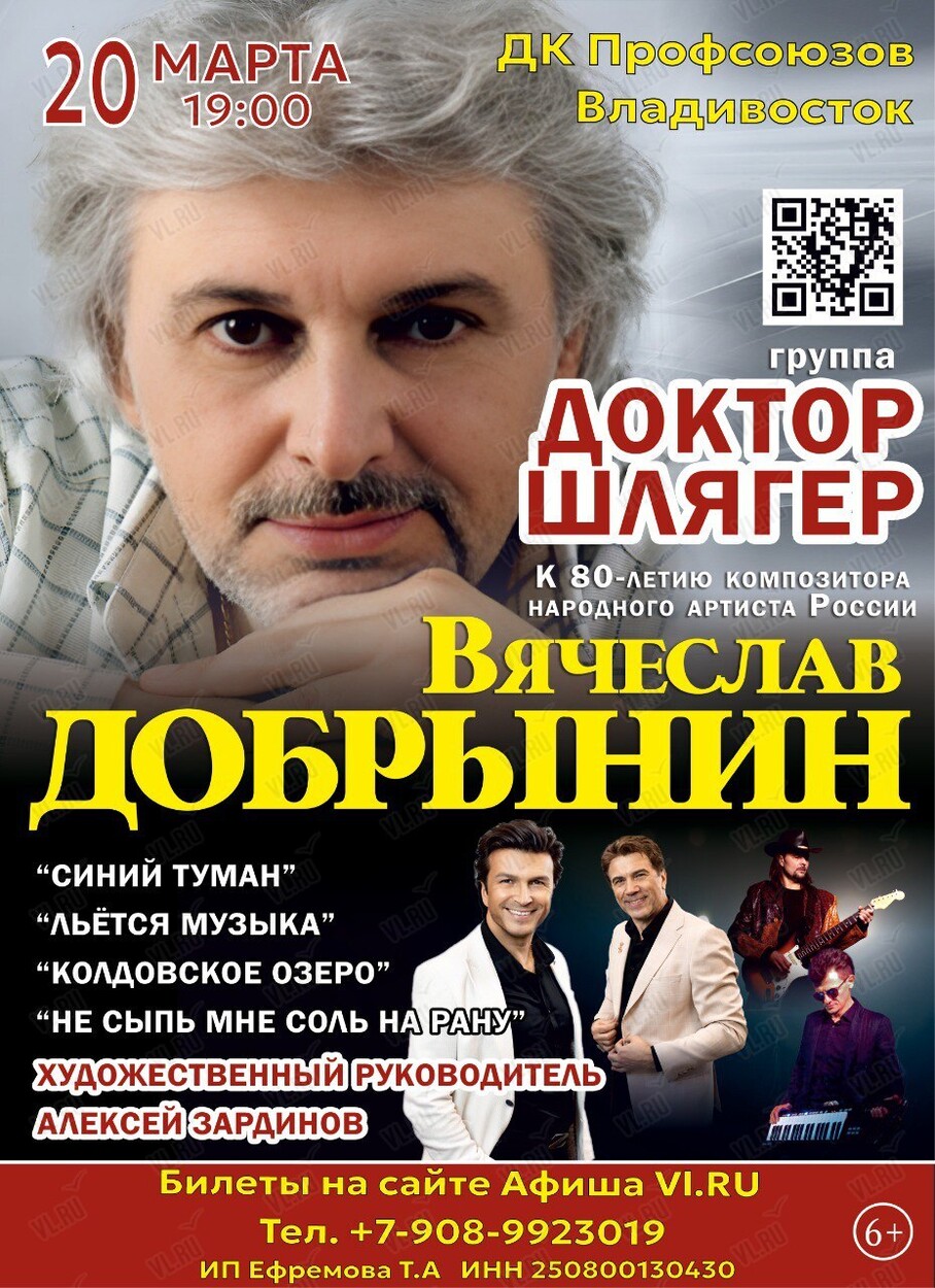 Концерт, посвящённый 80-летию со дня рождения композитора Вячеслава Добрынина - легендарного советского и российского композитора и певца, лауреата всесоюзных и международных конкурсов и фестивалей, народного артиста РФ.