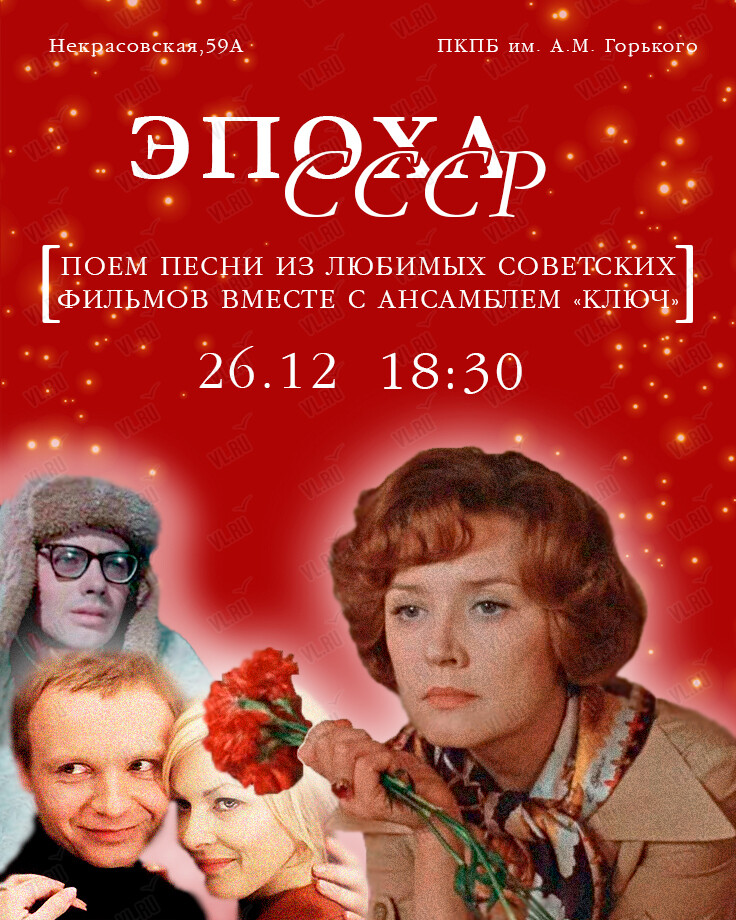 26 декабря в Библиотеке им. А. М. Горького пройдет новогодний концерт «Эпоха СССР», где прозвучат песни из советских фильмов под гитару в исполнении ансамбля «Ключ».
