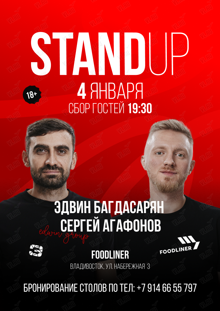 4 января вас ждёт вечер настоящего юмора! На 3 этаже FOODLINER выступят комики, которых вы точно видели на THT. Эдвин Багдасарян и Сергей Агафонов приготовили для вас свой лучший материал. Живой юмор и дружественная атмосфера сделают этот вечер по-настоящему запоминающимcя.