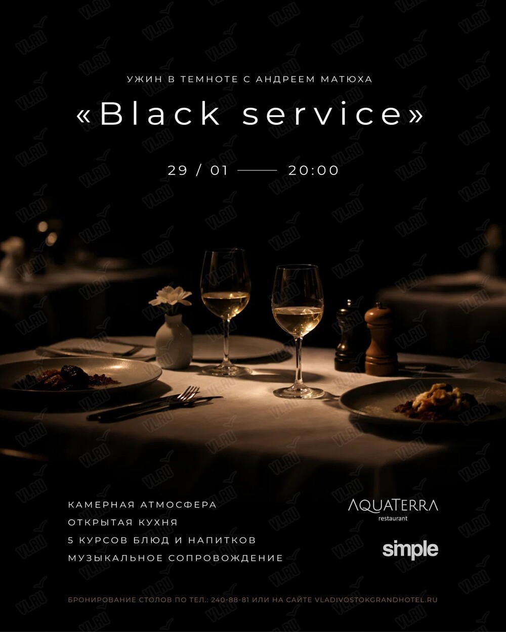 Ресторан AquaTerra представляет эксклюзивное событие этого января: гастрономический вечер «Ужин в темноте | Black Service» с бренд-шефом VLADIVOSTOK Grand Hotel & SPA Андреем Матюхой.
