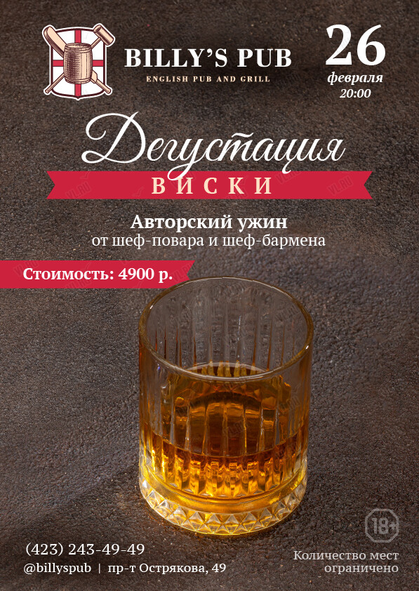 26 февраля в Billy's Pub пройдет дегустация виски!