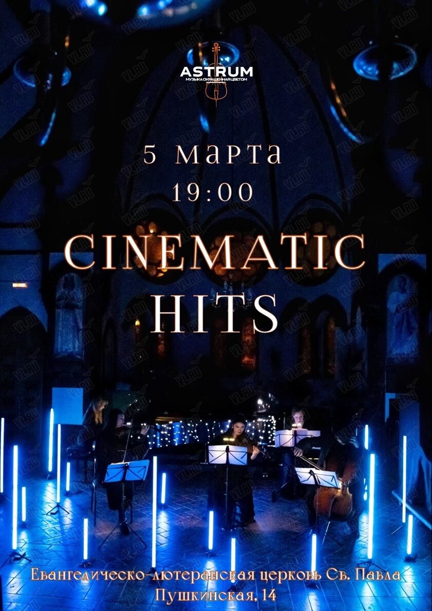 Cinematic Hits от проекта «Astrum. Музыка, окрашенная цветом» - это программа, включающая в себя музыку Дж. Уильямса, Д. Элфмана, Х. Циммера, Вангелиса и многих других выдающихся кинокомпозиторов.