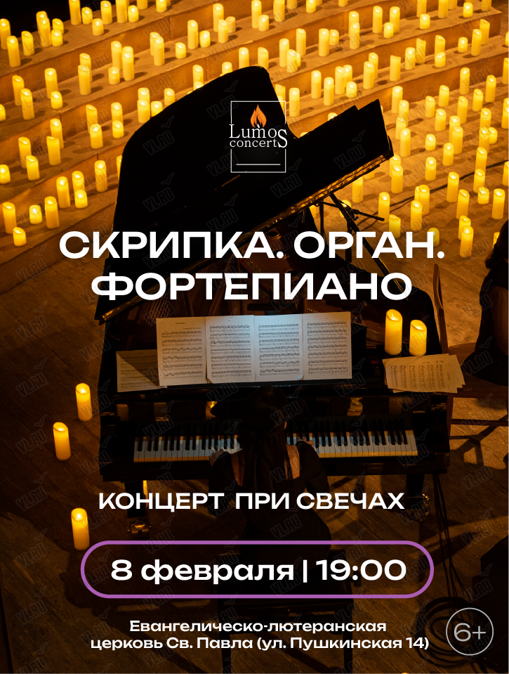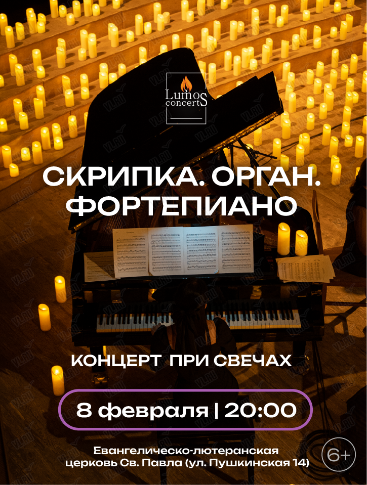 Музыкальный проект «Lumos concerts» 8 февраля представит «Скрипка. Орган. Фортепиано» при свечах в Церкви св. Павла - одном из самых атмосферных мест города Владивостока!