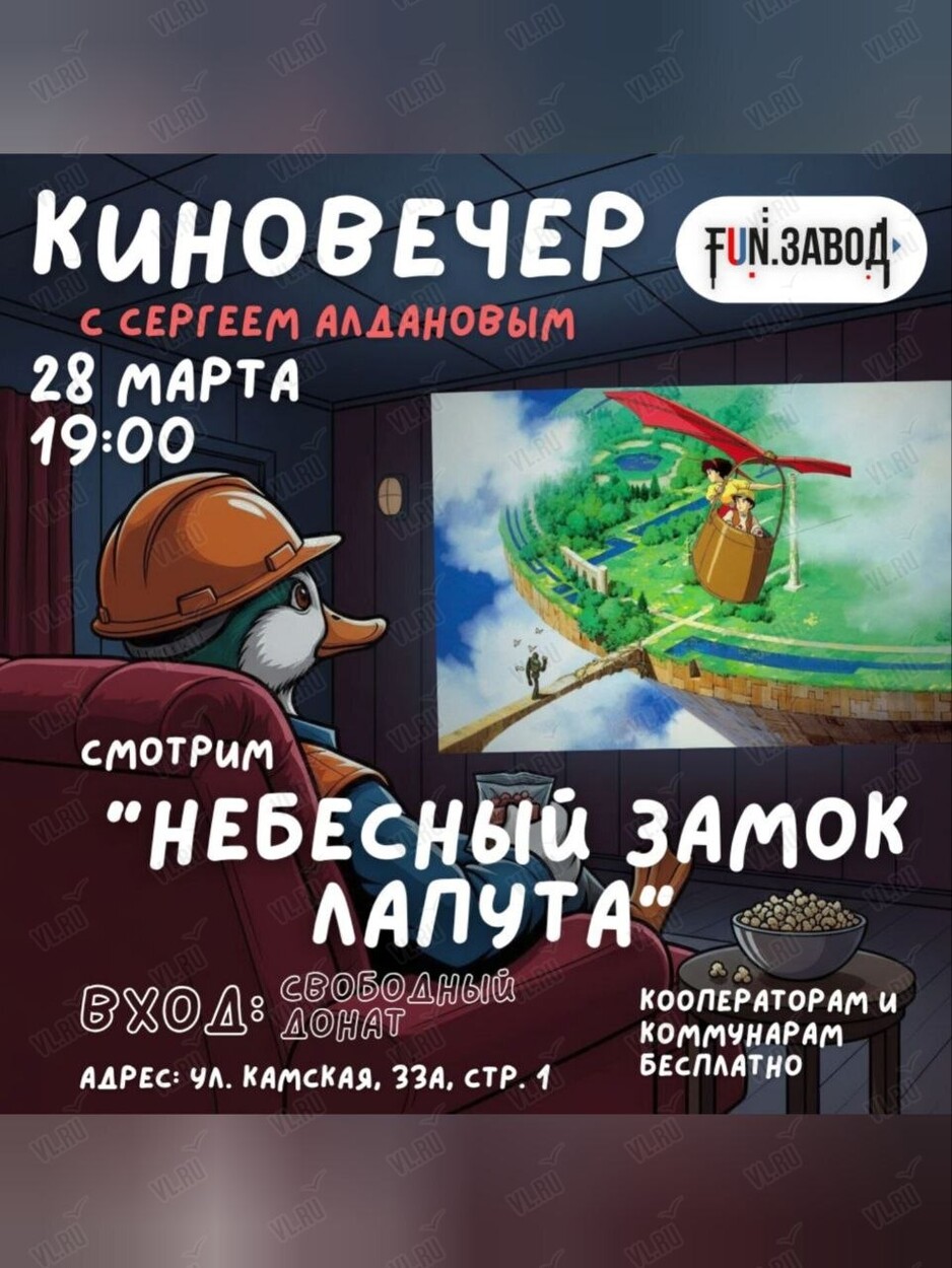 28 марта в 19:00 во Владивостоке на FUN.Заводе состоится просмотр и обсуждение анимационного фильма Хаяо Миядзаки – «Небесный замок Лапута» с Сергеем Алдановым.