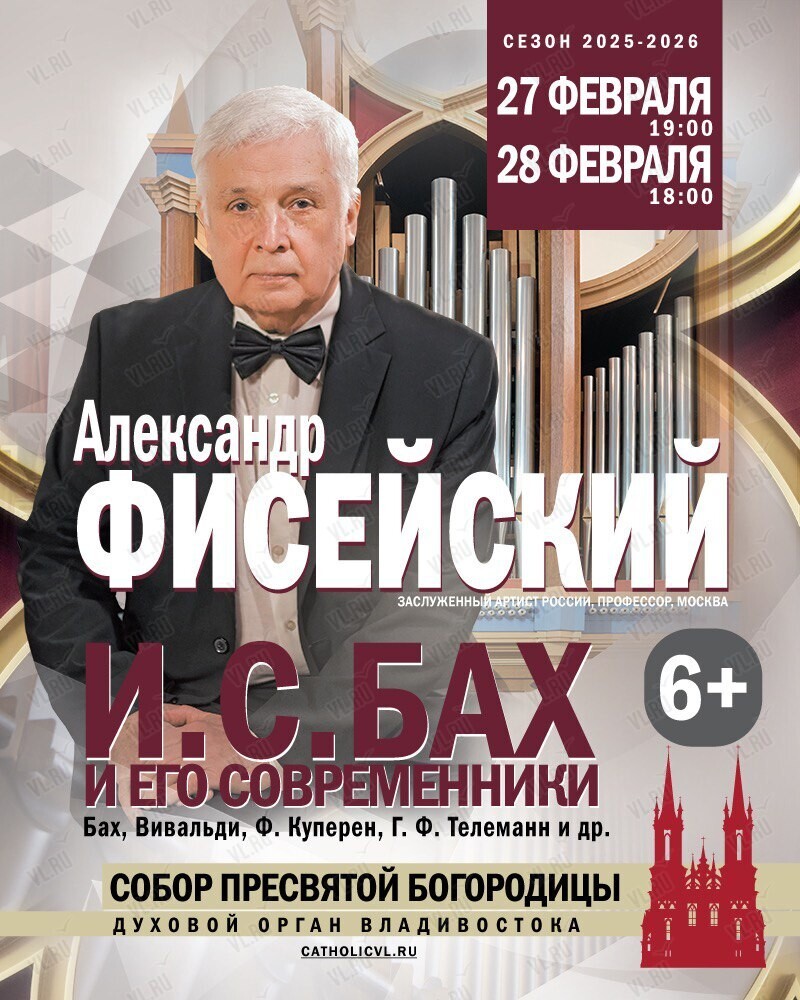 Маэстро Александр Фисейский, один из немногих музыкантов в мире, неоднократно исполнявший абсолютно все органные шедевры И.С.Баха, в том числе, и на его родине, представит жителям Владивостока свою программу «Бах и его современники» в рамках Евразийского органного марафона 2026.