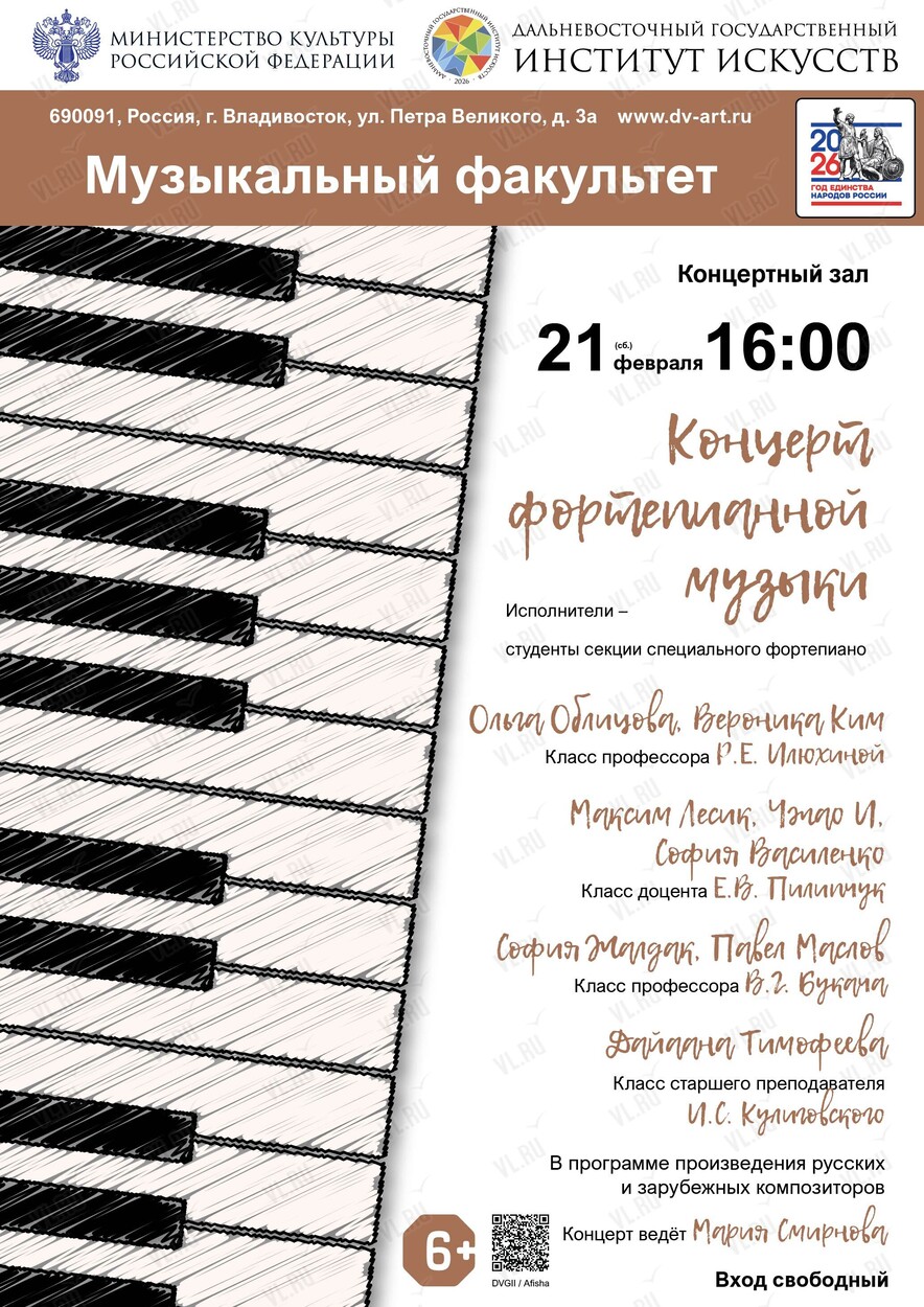 Дальневосточный государственный институт искусств приглашает 21 февраля на концерт фортепианной музыки!