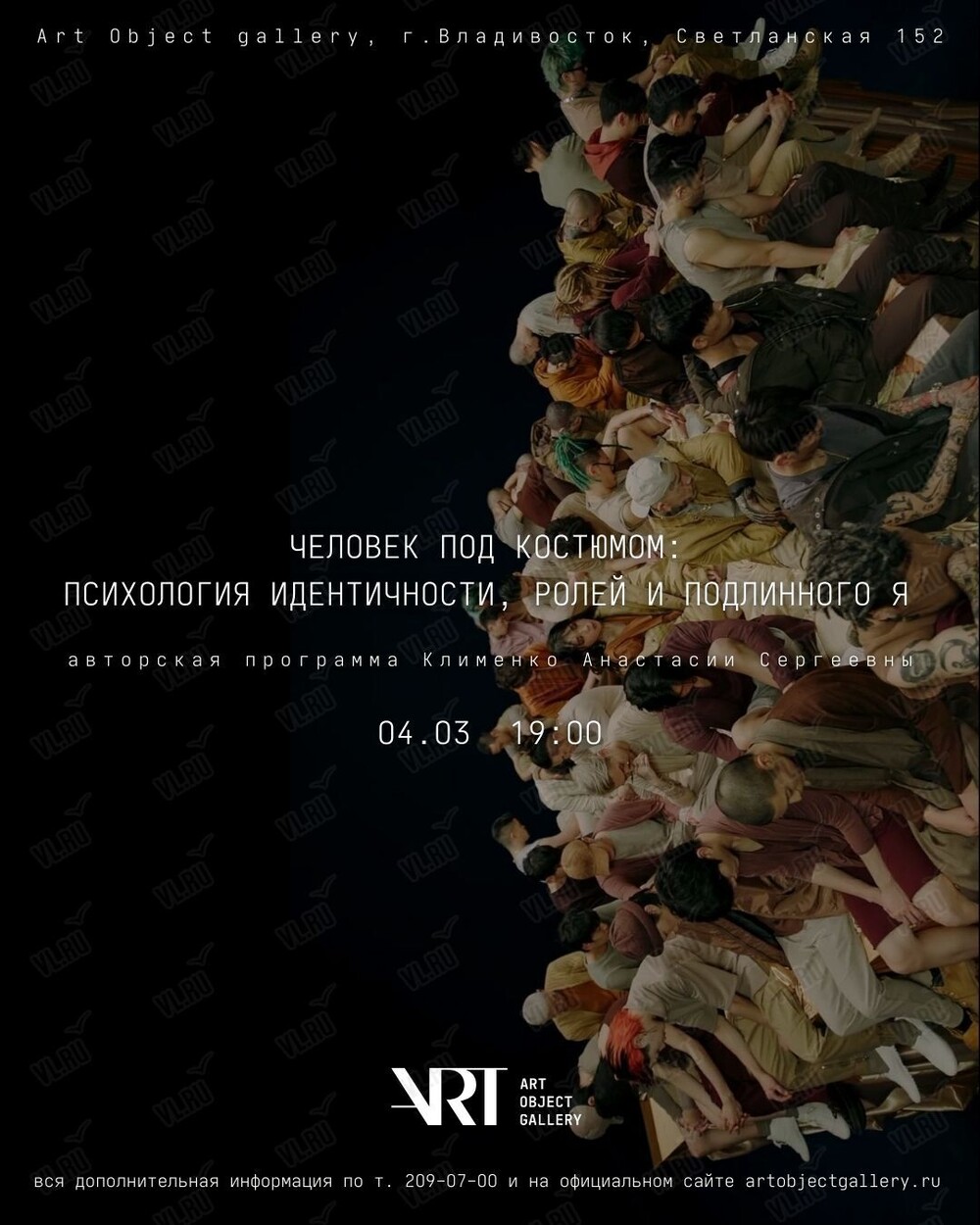 4 марта в пространстве Art Object Gallery пройдет лекция «Человек под костюмом: психология идентичности, ролей и подлинного Я»!
