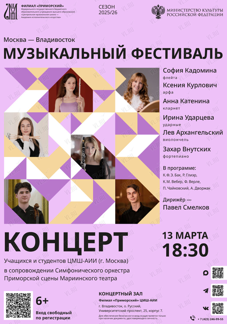 Филиал «Приморский» Центральной музыкальной школы — Академии исполнительского искусства приглашает посетить Музыкальный фестиваль 13 и 14 марта во Владивостоке.