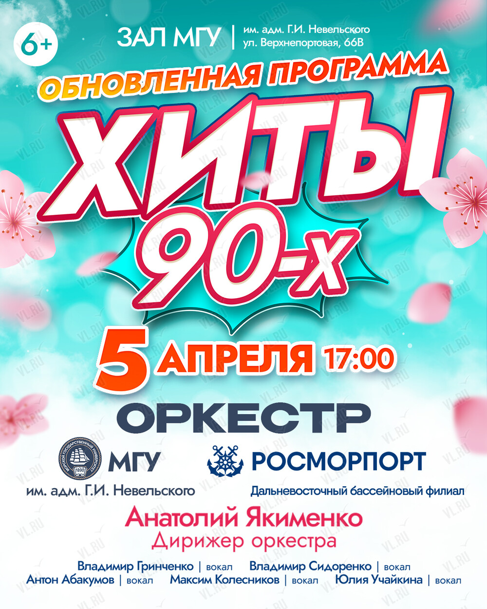 5 апреля в концертном зале МГУ им. адм. Г.И. Невельского эстрадный оркестр МГУ им. адм. Г.И. Невельского и Дальневосточного бассейнового филиала ФГУП «Росморпорт» (дирижер оркестра Анатолий Якименко) с обновленной программой «Хиты 90-х».