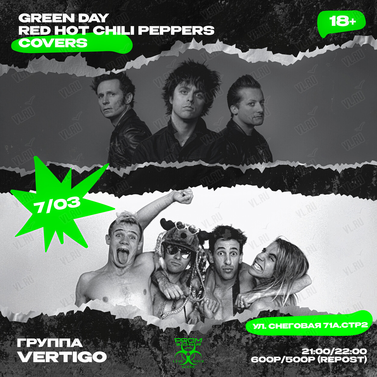 Готовы зарядиться бешеной энергией? Жми паузу на рутине и приходи в Prom Zona, где мэтры альтернативы Green Day и Red Hot Chili Peppers зазвучат в живом исполнении группы Vertigo!