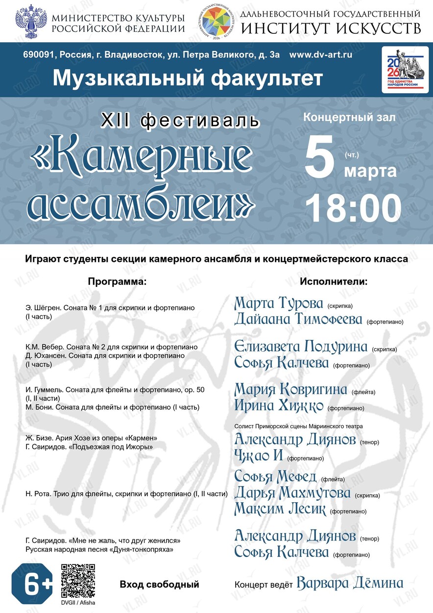 5 марта в Дальневосточном государственный институт искусств – XII Фестиваль «Камерные ассамблеи»!