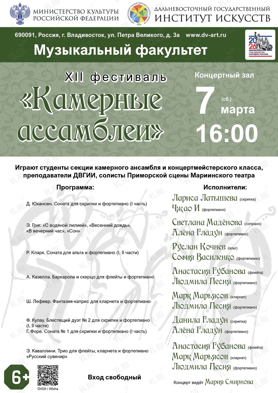 7 марта в Дальневосточном государственный институт искусств – XII Фестиваль «Камерные ассамблеи»!