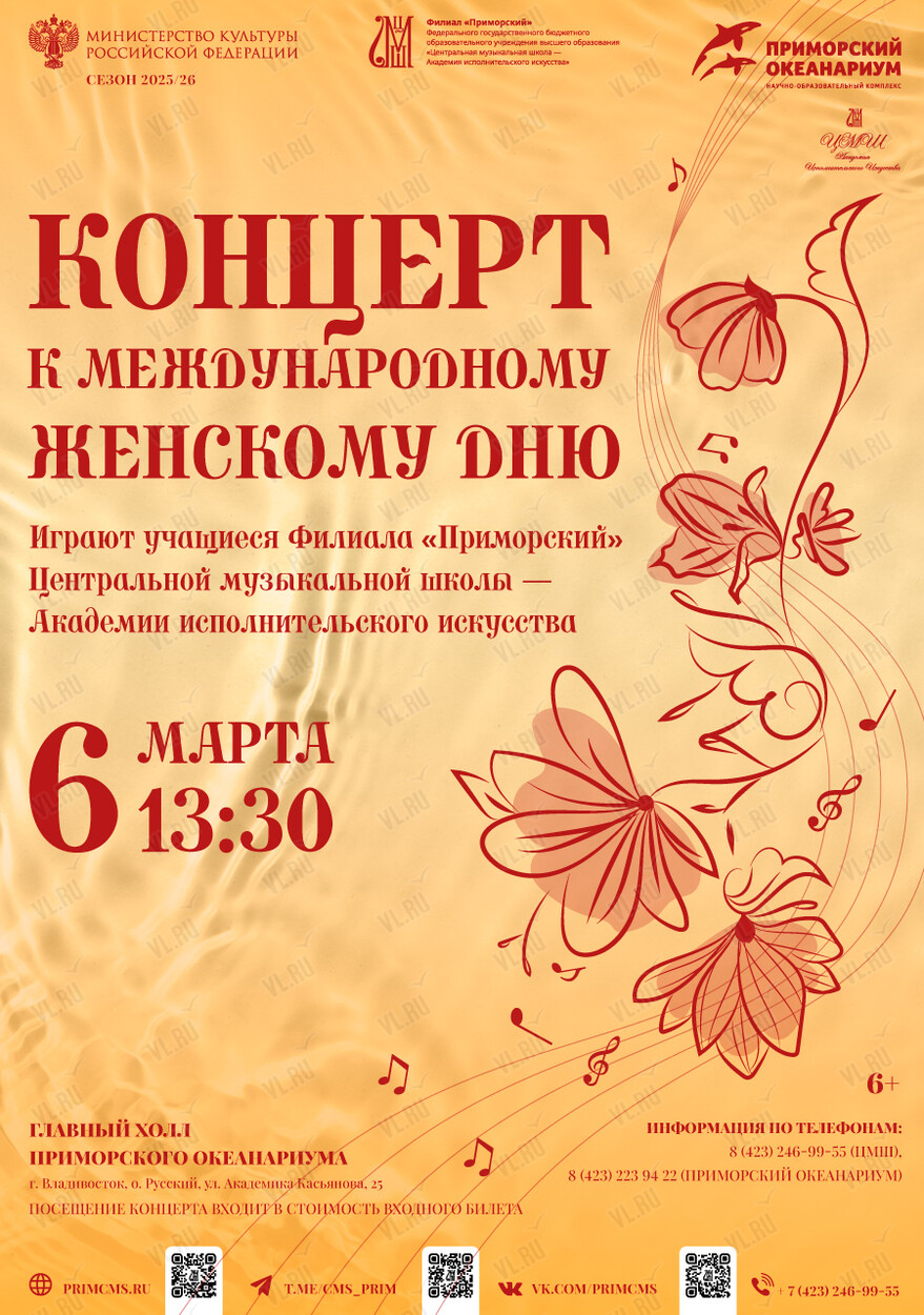 Министерство культуры Российской Федерации Филиал «Приморский» Федерального государственного бюджетного образовательного учреждения высшего образования «Центральная музыкальная школа – Академия исполнительского искусства» приглашает 6 марта на концерт, посвященный Международному женскому дню.