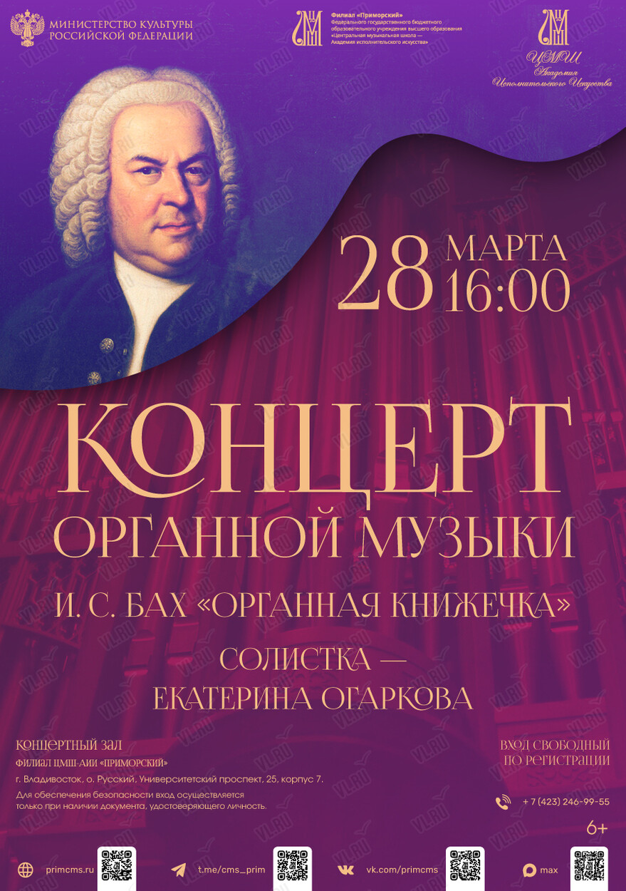 Министерство культуры Российской Федерации. Филиал «Приморский» Федерального государственного бюджетного образовательного учреждения высшего образования «Центральная музыкальная школа – Академия исполнительского искусства» приглашает на концерт органной музыки «И. С. Бах. Органная книжечка».