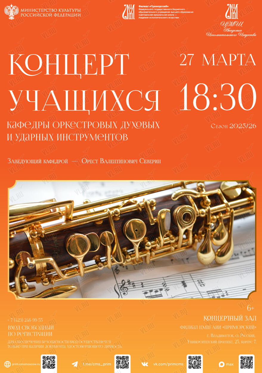 Министерство культуры Российской Федерации Филиал «Приморский» Федерального государственного бюджетного образовательного учреждения высшего образования «Центральная музыкальная школа – Академия исполнительского искусства» приглашает на концерт кафедры оркестровых духовых и ударных инструментов!