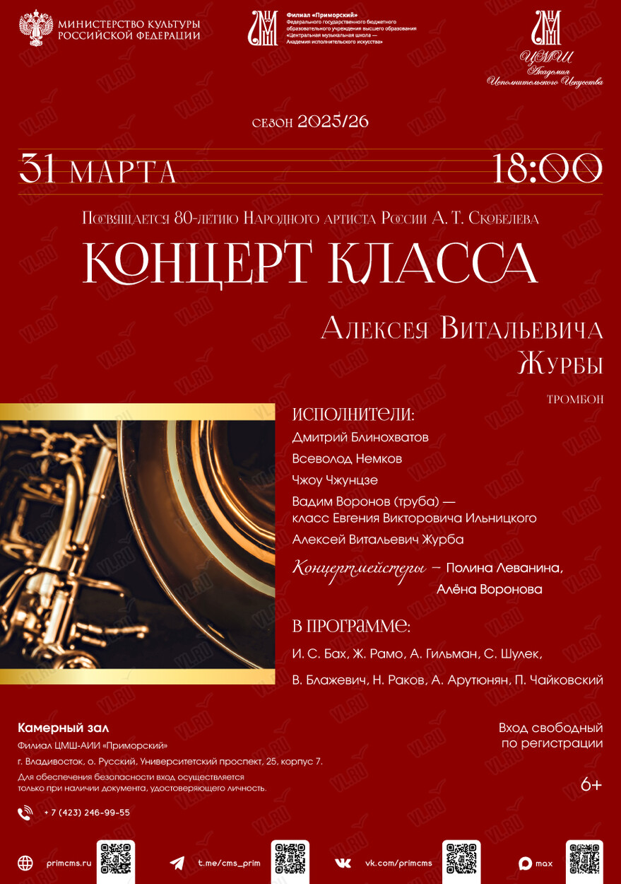 Вы зарегистрированы на событие «Концерт класса Алексея Витальевича Журбы (тромбон)», на 31 марта 18:00