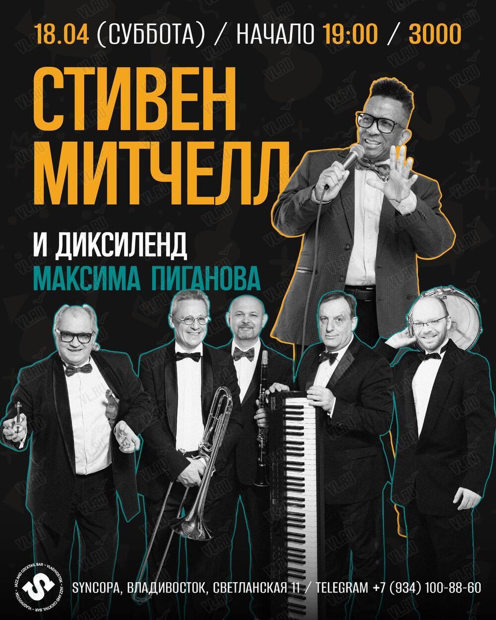 18 апреля на сцене джаз-бара Syncopa выступит Стивен Митчелл (вокал, США) и «Диксиленд Максима Пиганова» (Москва)!