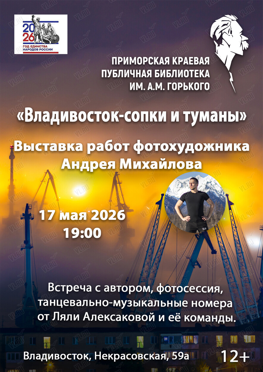 Фотовыставка посвящена любимому городу Владивостоку и называется «Владивосток - сопки и туманы». Открытие выставки смогут посетить все желающие. Гости смогут пообщаться с фотографом, задать вопросы о работах и творческом пути.