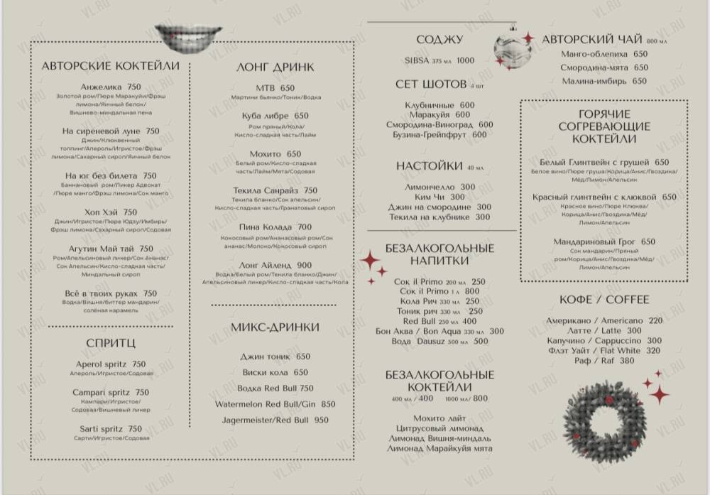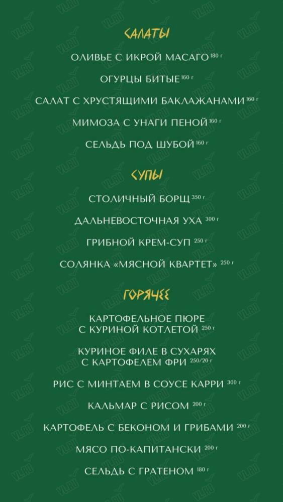 Это место, где музыка звучит каждый день. На сцене - популярные группы и вокалисты из Приморья и всей России, кавер-коллективы, трибьюты культовых исполнителей и акустические концерты. А по вечерам атмосфера накаляется драйвовыми вечеринками с MC и DJ-резидентами, создающими настоящую музыкальную эйфорию.