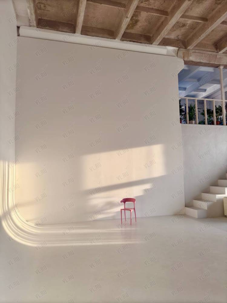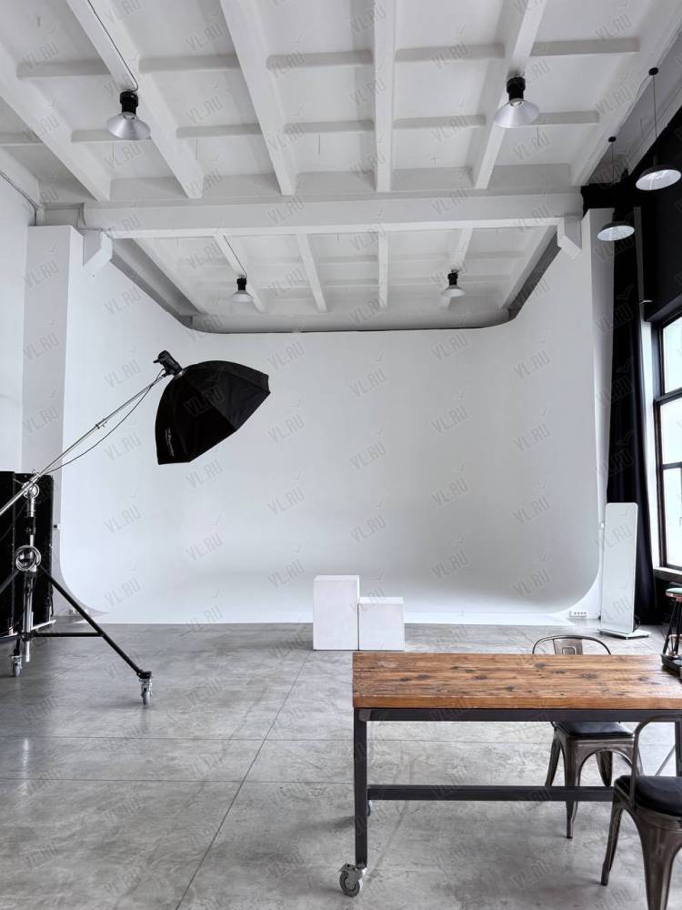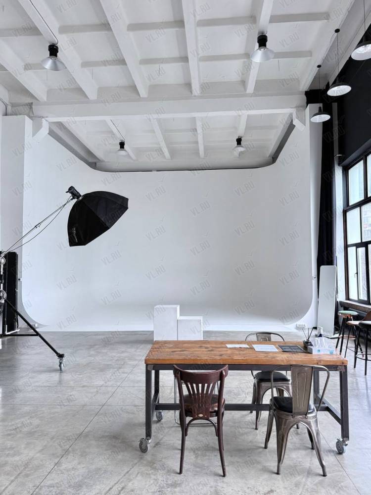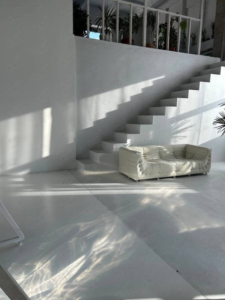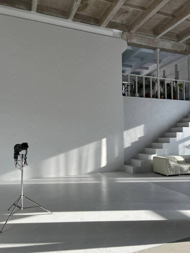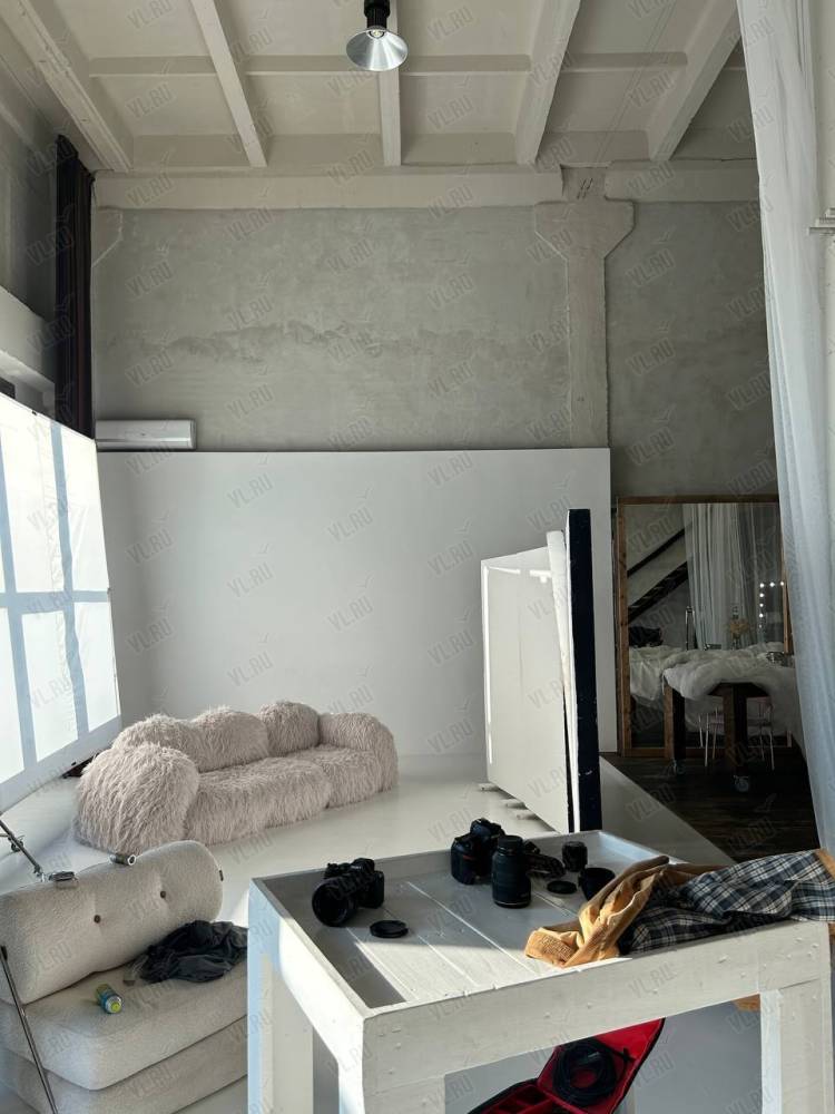 WHITE HALLl. Зал Трансформер. Площадь 170 кв. Потолки 7 метров, 2 больших окна, юго-западная сторона. Съемки с дневным и закатным светом. Бетонный Лофт, Различная мебель и реквизит, Гримерный стол в зале студии, Импульсный, постоянный свет и цветной свет RGB(различные светоформирующие насадки)