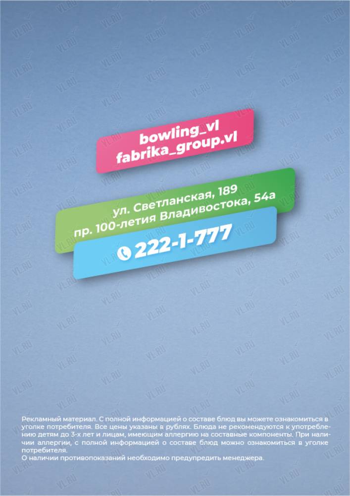 Сеть боулинг-центров Фабрика - это уютные боулинги, оснащенные лидером индустрии компанией Brunswick. Два уютных кафе расположенных в разных районах города, игровые автоматы и бильярд.
