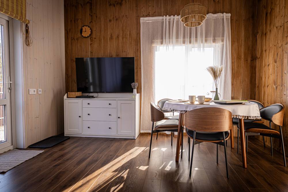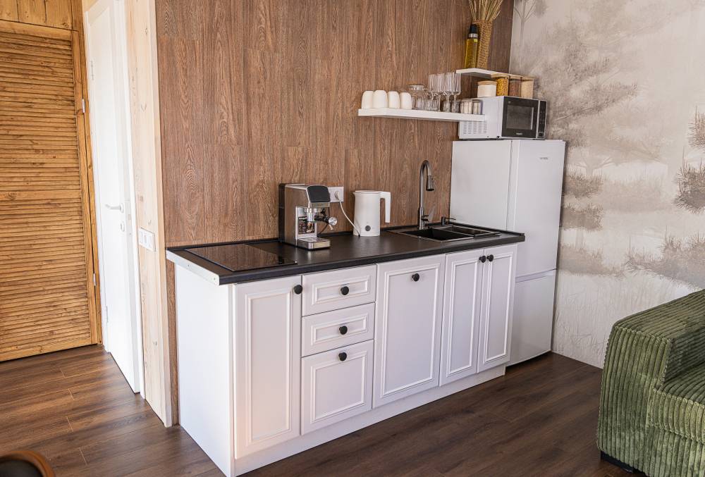 Питание организуется самостоятельно. Есть кухонная зона со всей необходимой посудой и техникой. На террасе оборудована мангальная зона для приготовления блюд на огне. В 5-ти минутах езды расположен ресторан.