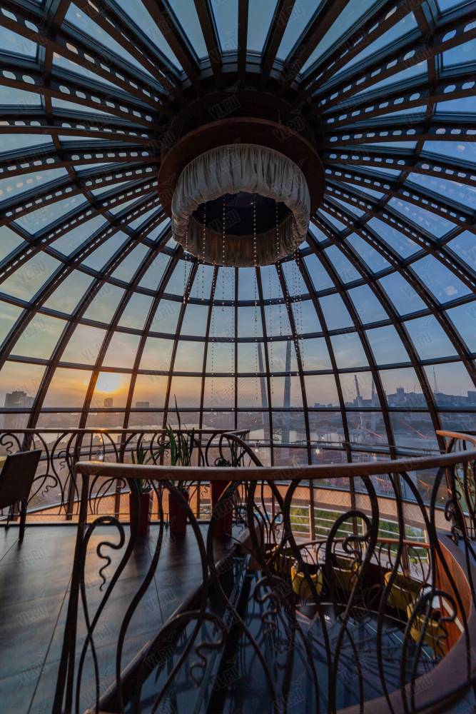 В центре ресторана под стеклянным куполом располагается большой панорамный зал, выполненный в романтическом стиле.