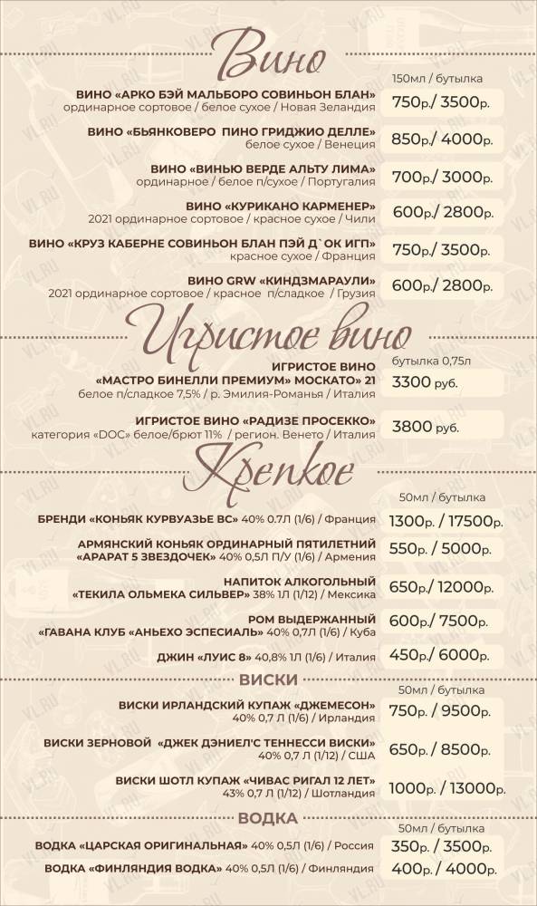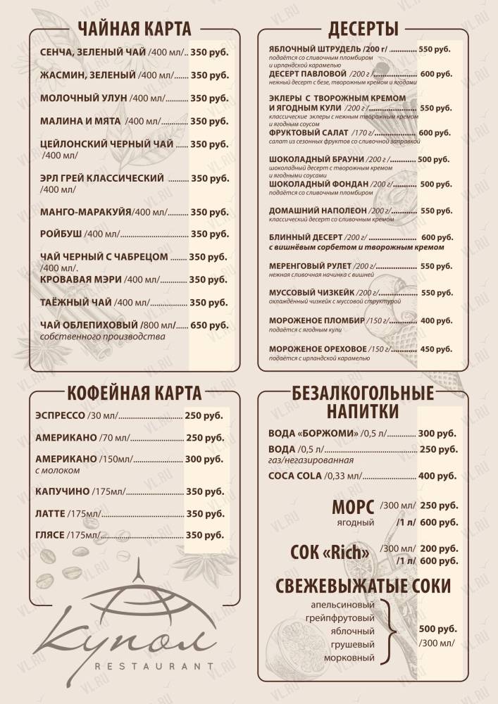 В заведении широкий ассортимент блюд, напитков и десертов.