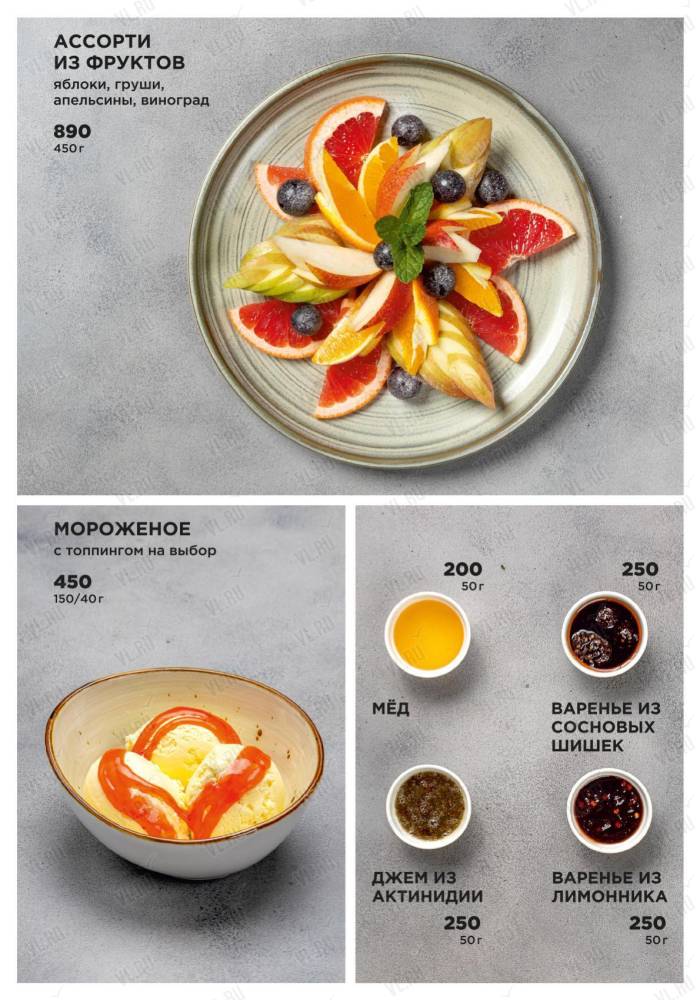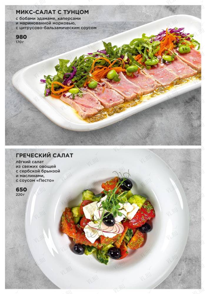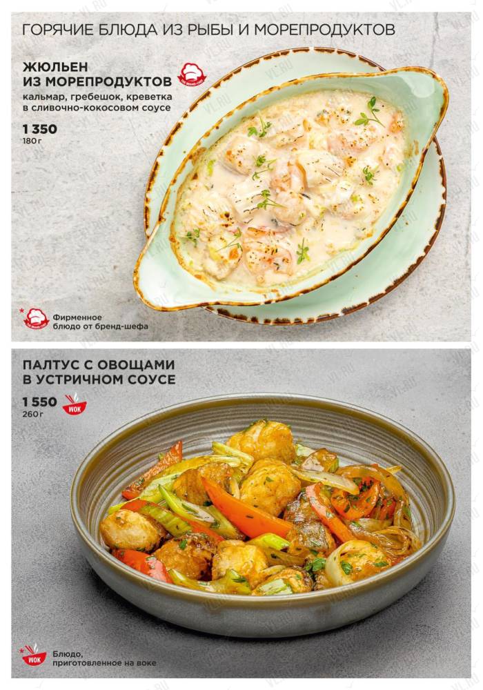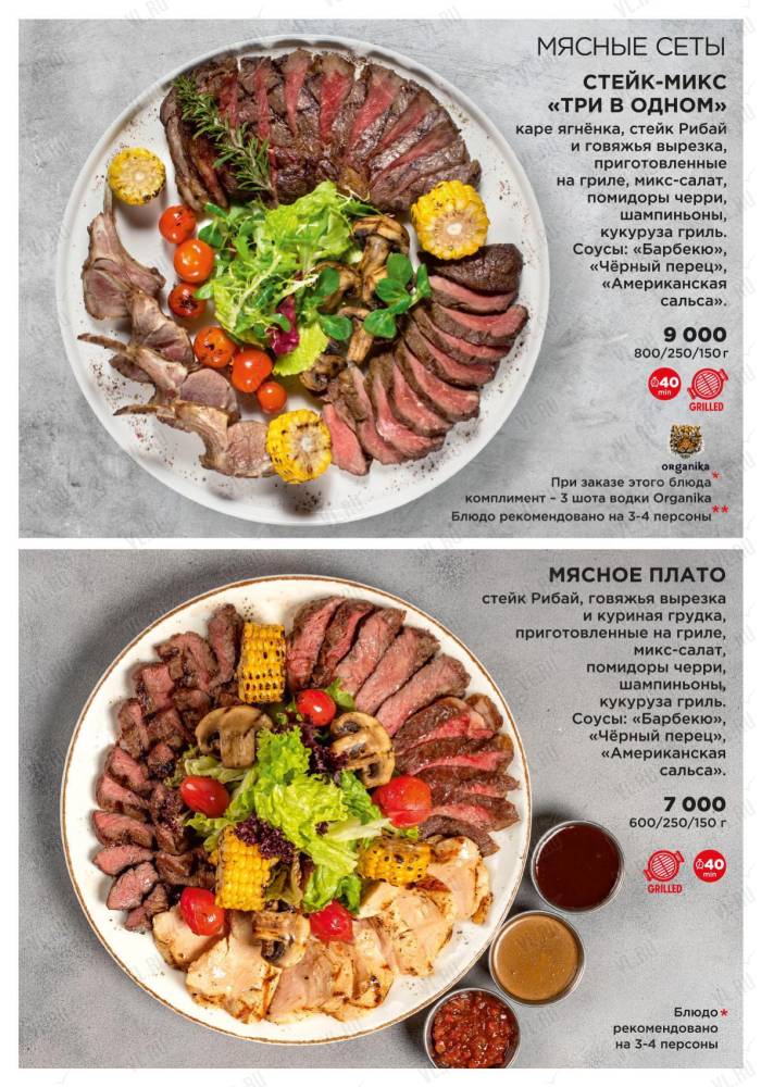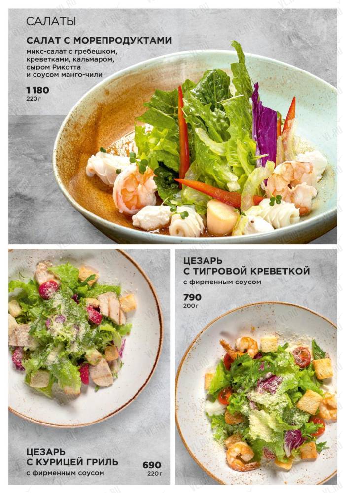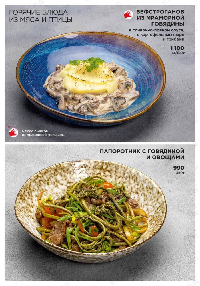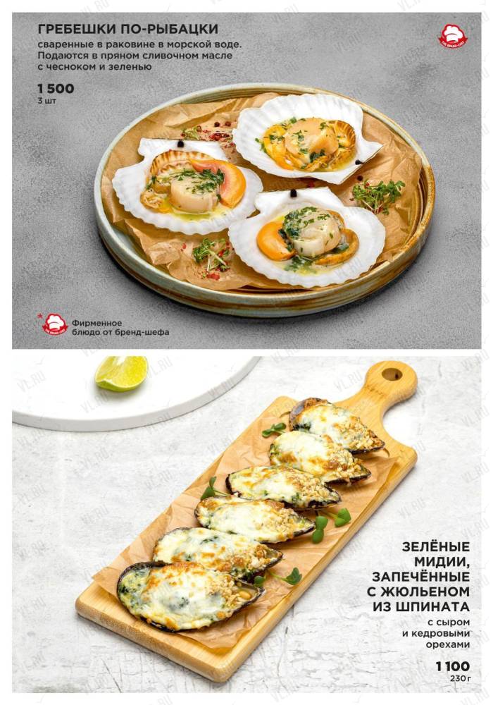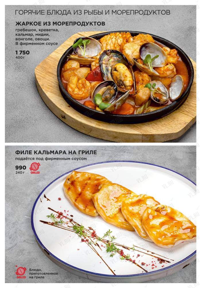 Ресторан предлагает своим гостям стейки из премиальных отрубов мраморной говядины и блюда из даров Японского моря – гребешка, креветок, устриц и крабов.